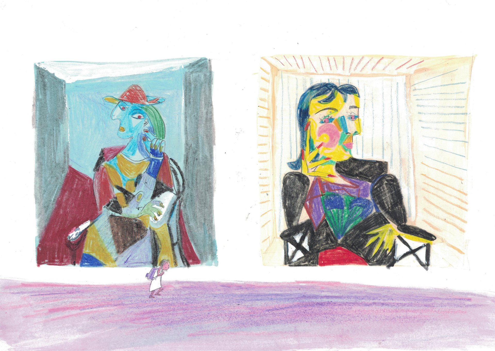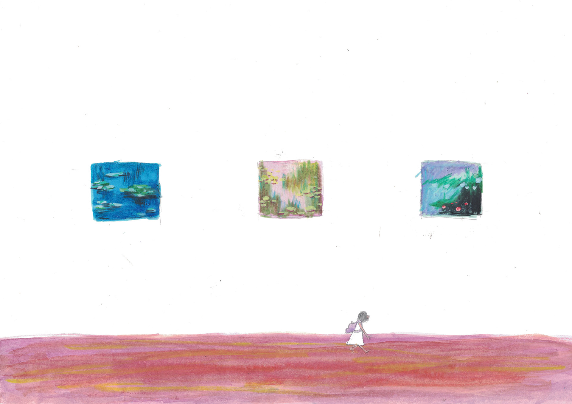 the girl wanders through a museum, moving quietly from one frame to the next.