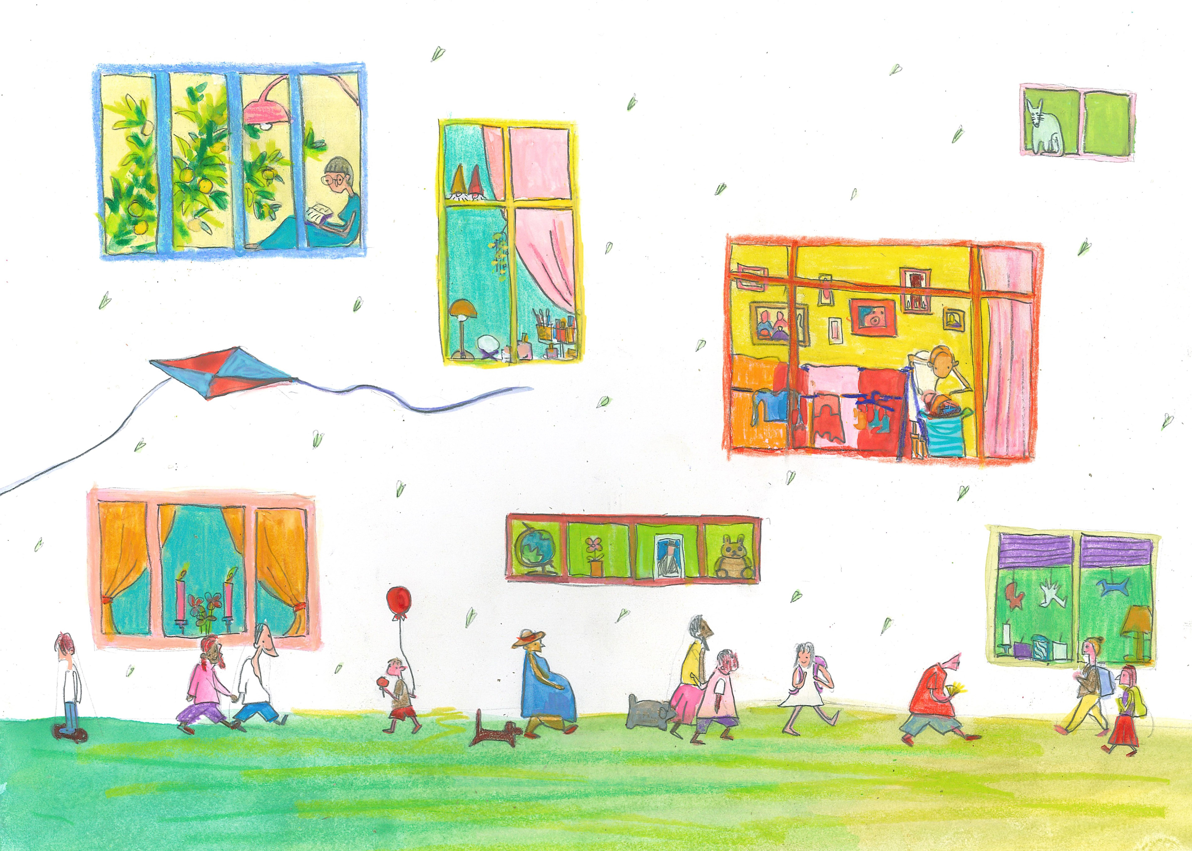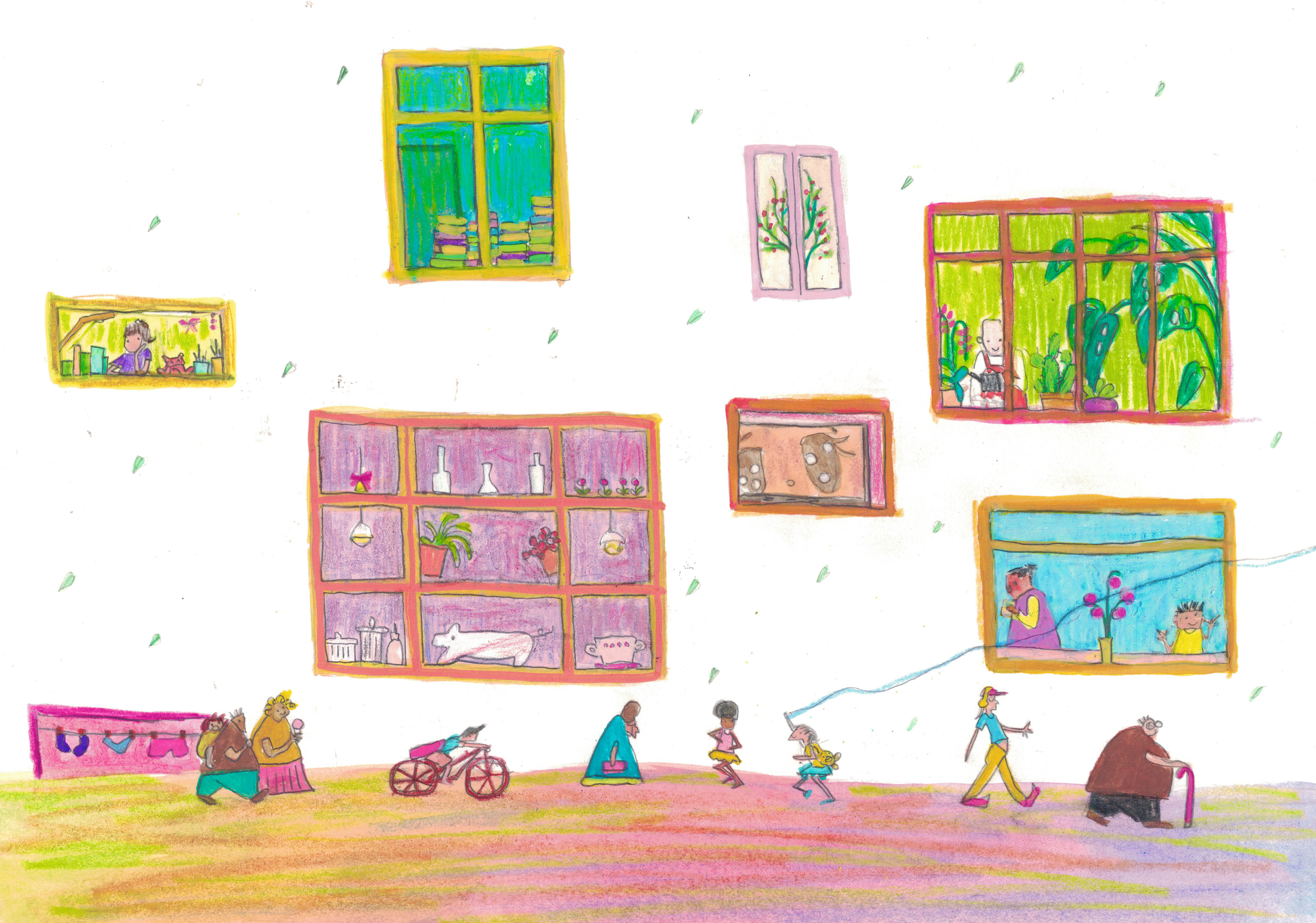 Each window holds a small, unspoken story, and she pauses to imagine every one of them.